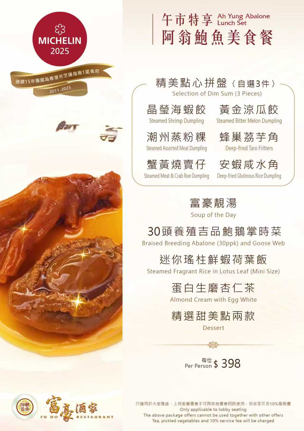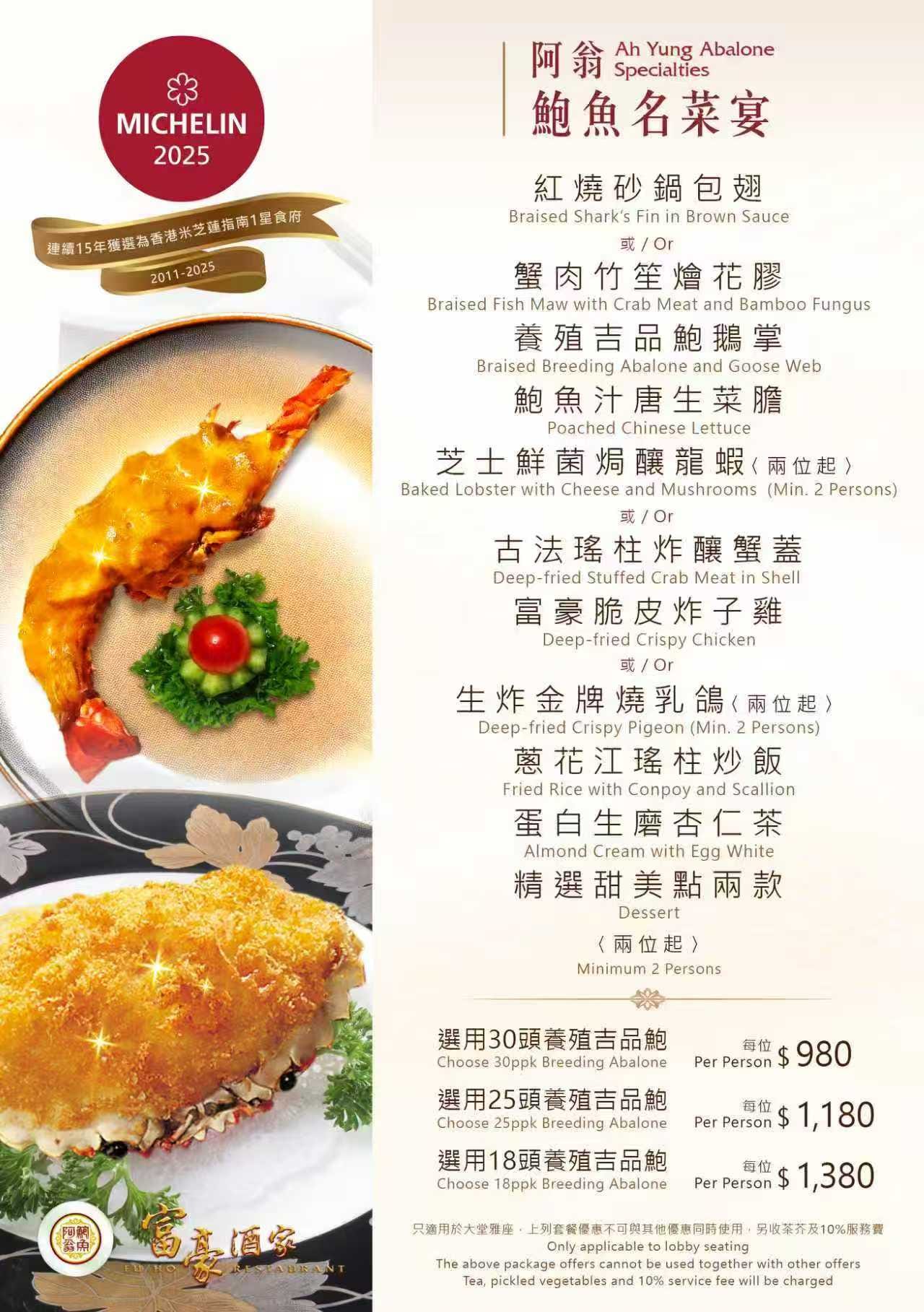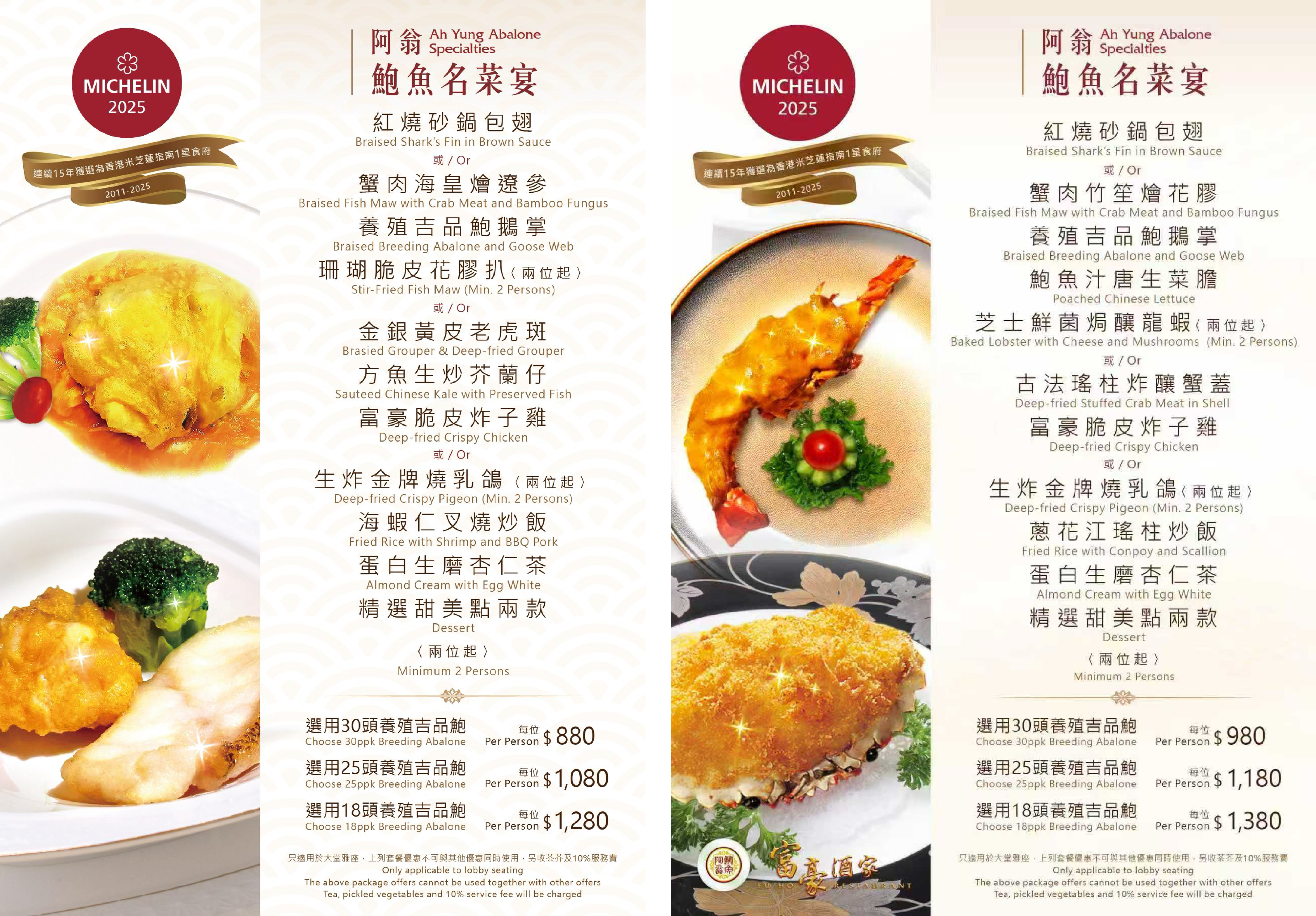 坊間提及鮑參翅肚, 普遍人都認為是貴價菜餚, 很容易令人聯想到享用鮑參翅肚就一定是費用不菲,其實這是個美麗的誤會。阿翁說:「富豪酒家是一間香港制作的傳統廣東菜酒家,除了鮑參翅肚燕窩,還有各式精緻美味的點心和撚手小菜,游水海鮮供客人選擇,而我們的招牌菜﹣阿翁鮑魚確實是一道不可不嚐的高級名貴菜式,但由於阿翁親自向世界各地搜羅并批量採購鮑參翅肚燕窩等優質高級食材因此而降低成本.並精心設計配以不同特式名菜組成的各款《阿翁鮑魚美食宴》益食家價錢親民,確是經濟實惠。」