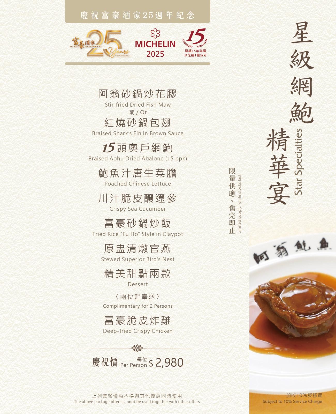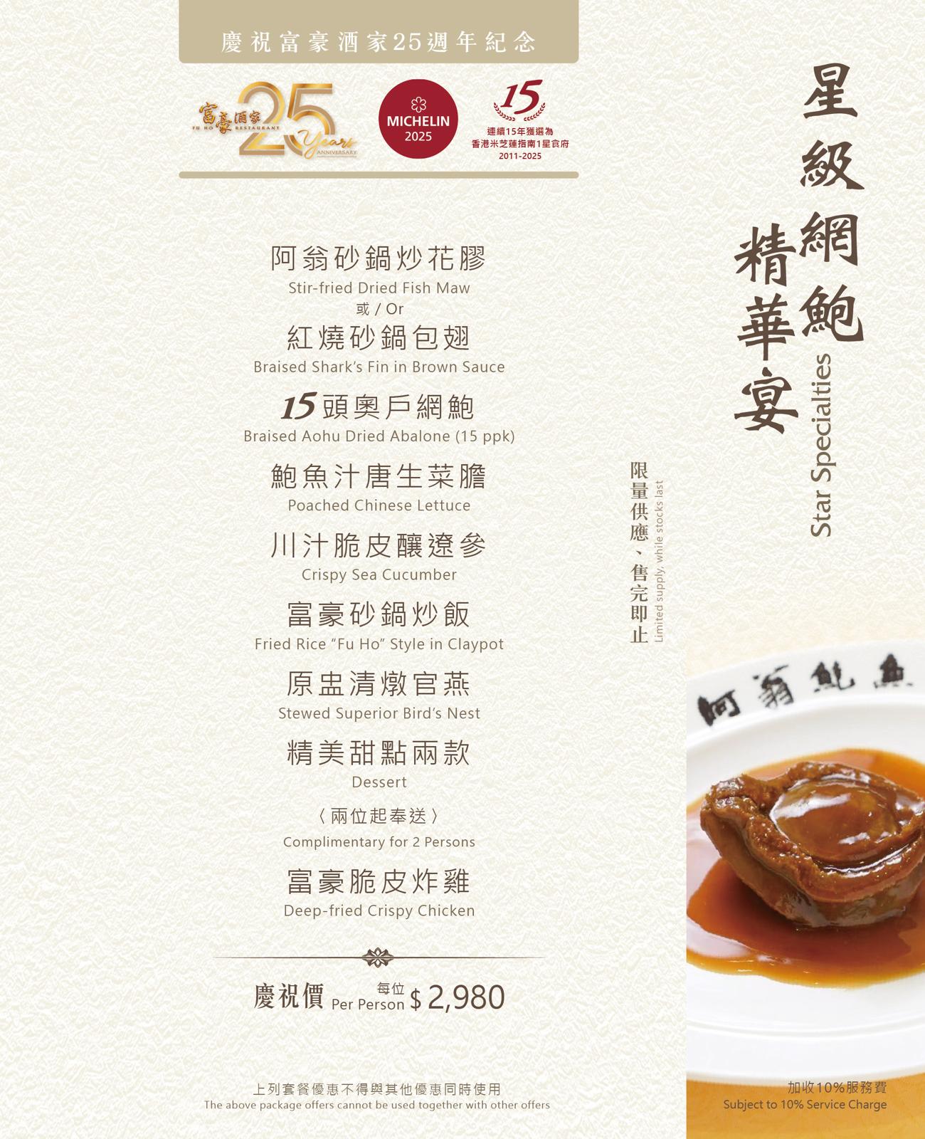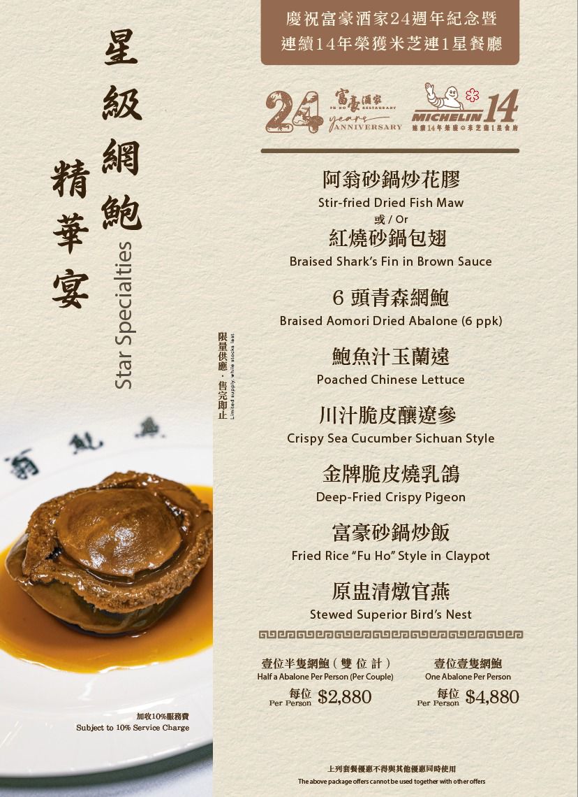 坊間提及鮑參翅肚, 普遍人都認為是貴價菜餚, 很容易令人聯想到享用鮑參翅肚就一定是費用不菲,其實這是個美麗的誤會。阿翁說:「富豪酒家是一間香港制作的傳統廣東菜酒家,除了鮑參翅肚燕窩,還有各式精緻美味的點心和撚手小菜,游水海鮮供客人選擇,而我們的招牌菜﹣阿翁鮑魚確實是一道不可不嚐的高級名貴菜式,但由於阿翁親自向世界各地搜羅并批量採購鮑參翅肚燕窩等優質高級食材因此而降低成本.並精心設計配以不同特式名菜組成的各款《阿翁鮑魚美食宴》益食家價錢親民,確是經濟實惠。」
